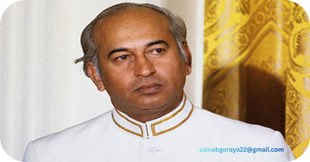 ذولفقار علی بھٹو ملک کے مقبول اور طاقتور ترین حکمران،کیلیفورنیا سے سیاسیات،آکسفورڈ سے ایل ایل ایم کیا،لنکنز ان سے بار کیا، متعدد وزارتیں لیں،شعلہ بیان مقرر، 1977 کے دھاندلی زدہ الیکشن،اپوزیشن سڑکوں پر اوربھٹو صاحب کی انا ساتویں آسمان پر، 5 جولائی 1977 کو فوج نے ملک کا کنٹرول سنبھال لیا بھٹو کو گرفتار کر کے مری پہنچا دیا گیا،مقصد بھٹو کو شرمندہ اور بے دست و پا کرنا تھا،23 دن بعد رہائی ہوئی،باہر نکل کر بھٹو نے پہلی تقریر کی ؛میں انکی مونچھوں کے ساتھ اپنے تسمے باندھوں گا؛ میں جس دن اقتدار میں آگیا جج اور جرنیل دونوں نہیں بچیں گے۔چنانچہ دوبارہ گرفتار کر لیے گئے،اور دونوں کے اتحاد سے تختہ دار پر چڑھا دے گئے، بھٹو کی ضد،زعم اور غلط فہمی انہیں پھانسی کے پھندے تک لے گئی، بھٹو جدی پشتی رئیس تھے، چاروں بچوں کو دنیا کی ہر نعمت میسر
